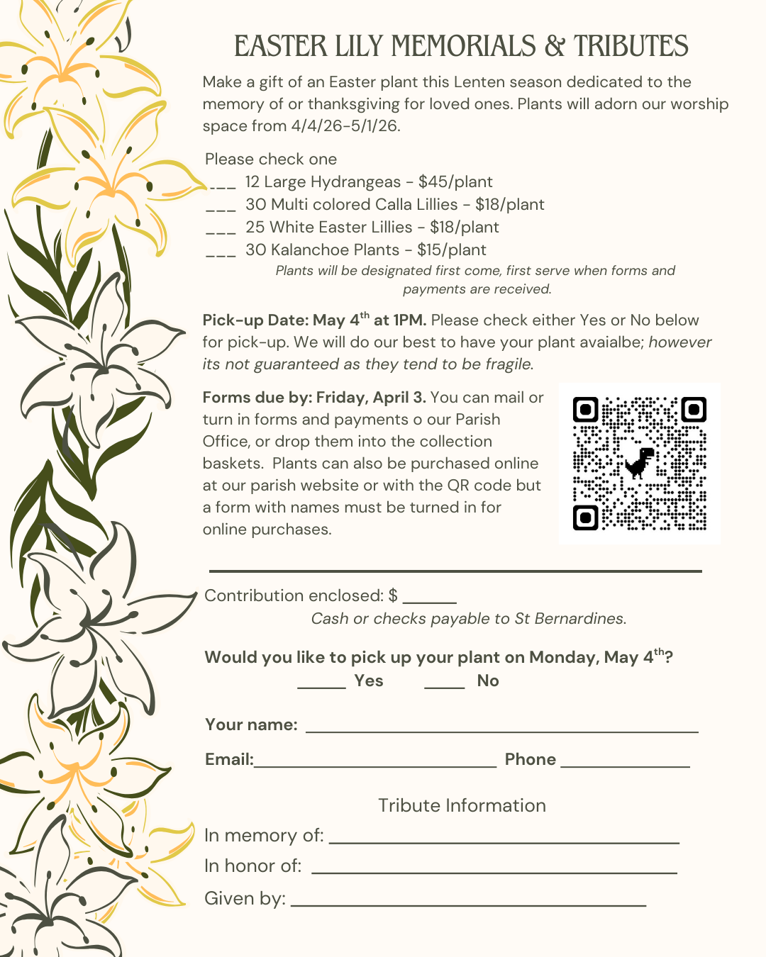 St. Bernardine of Siena invites you to make the gift of an Easter plant this Lenten season, dedicated either in memory of someone special or in thanksgiving for loved ones